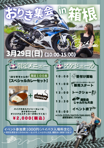人気ライダー「おりき」さんによるイベントを、バイカーズパラダイス南箱根にて開催します。
