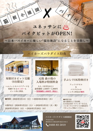 そして、このバイクピットのオープンを記念し、ユネッサン内の本格日帰り温泉「元湯森の湯」では、大人(中学生以上)1名様1,000円でご入場いただける大変おトクなキャンペーンを実施いたします。さらに今後、オフィシャルホテル「箱根小涌園天悠」「箱根ホテル小涌園」では、バイカー向けの特別プランを販売予定です。